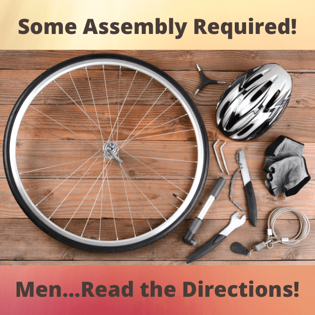 I decided to risk being disbarred and read the directions anyway. Now let me say it proved that we men are justified in not reading them in the first place. Whoever wrote these directions obviously didn’t have a clue about the bike thing or the English language. But I gave it due diligence and proceeded to assemble it. It only had about six major parts, so hey, it couldn’t be that hard. Right? Wrong.
