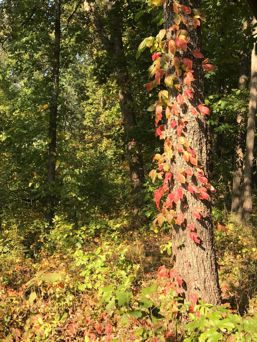 The prettiest colors came from an unlikely source.  Poison Ivy.  The forest floor was literally covered with it.  Almost every tree had more than one vine growing up its side.  The leaves, normally a rather ordinary color of green, were busting with colors of red and yellow.  Judy and I both wondered how something that could cause so much discomfort on your skin could bring so much wonder to the eyes. Amazing indeed.