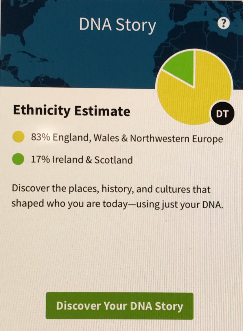 I always envisioned being related to William Wallace or some other great hero.  But when his results came in it turned out that we only had a 17% chance of being from Ireland or Scotland. That means there was about a one in five chance that I had an Irish brogue hidden somewhere in me and that was not enough for me to go and buy a kilt! A whopping 83% was plain ole English.  Yup…right there in Northern Europe.  I guess my ancestors got mad at the king or queen and took a ship to America.