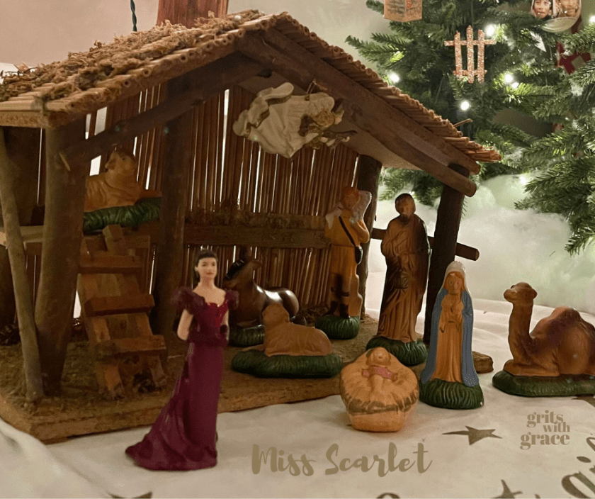 So, Miss Scarlet stayed and for the past 16 or 17 years, I still go to the attic and get the decorations down. I still find the old, tattered box and bring it down too. I carefully unpack the cast of that night in Bethlehem and there among the characters is Miss Scarlet. Each year, I make sure she was a prominent spot in the nativity and each year that reminds me that she is what Christmas is all about.