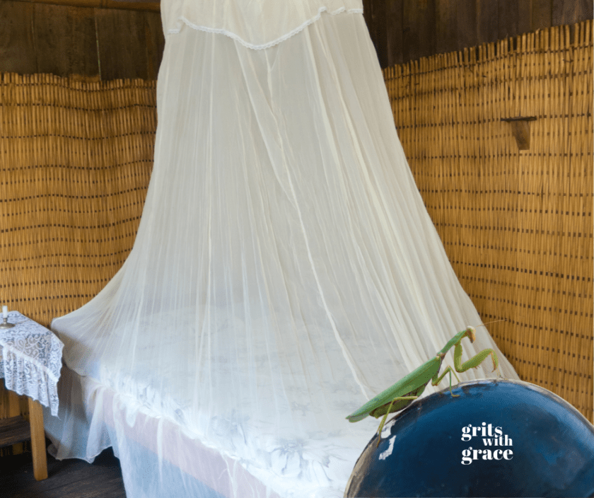 Judy and I headed back to our hut and prepared for bed. We had a mosquito net over our bed to keep out those pesky insects and their friends. Soon it was lights out and off to sleep. Sometime later, we were awakened by the sound of something larger than a mosquito. Lion? No. Tiger? No? Elephant? No. It was the…praying mantis. Apparently, he followed me home and waited for the lights to go out before once again taunting me. It turns out there was a small hole in the top of our mosquito net and he found his way in and then…it happened.