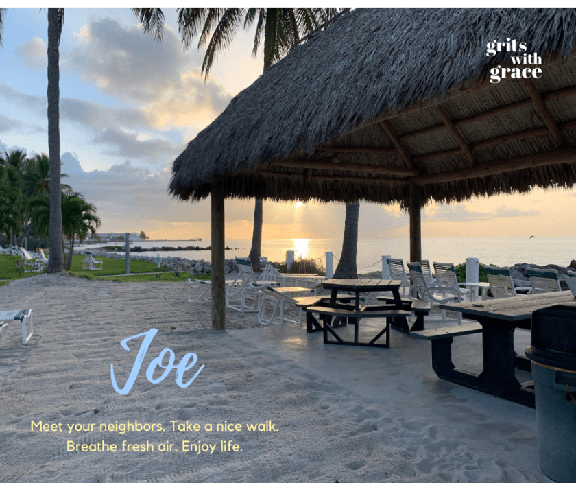“Hi. My name is Joe.” My wife Judy and I recently took a trip down to the Florida Keys and Key Colony in particular. The place we stayed was called the Continental Inn. It is a bit of old Florida with twenty or so studio condos combined with a small sand beach and a couple of tiki huts. It is not very crowded, but this was Labor Weekend, and there were more folks there than usual. Being a small place, it seems more like family than it does just a group of people on vacation. It was there under one of the tiki huts that I met Joe.