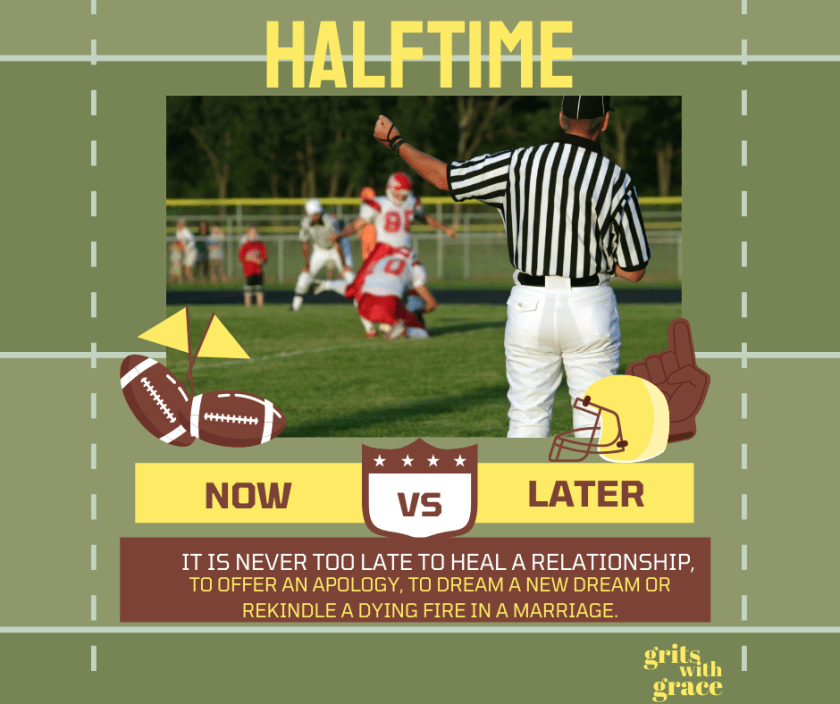 So, what is the lesson to be learned from this tragic tale?  Well, first, halftime is not too late. It is never too late to heal a relationship, to offer an apology, to dream a new dream or rekindle a dying fire in a marriage. I obviously don’t know where you are in your life’s game right now, but one thing is sure:  it is further into the game than it was yesterday!  If you are like me, well, I’m past halftime…but life is still full of challenges, adventures, opportunities and, well, life.  So, it’s not too late.  Regardless of what time your life clock says–if it is still running–you still have opportunities.  You see, what we can accomplish may change and how we accomplish it may be altered but the fact remains that we can still do something.