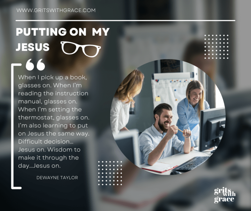 It took me awhile but now it is a natural reflex for me to put my glasses on. When I pick up a book, glasses on. When I’m reading the instruction manual, glasses on.  When I’m setting the thermostat, glasses on.  I’m also learning to put on Jesus the same way.  Difficult decision…Jesus on.  Wisdom to make it through the day…Jesus on.  Need help forgiving or being kind…Jesus on.  Paul, one of the writers in the New Testament, says that we should make it a point to put on Jesus, but he doesn’t stop there. He says that we should not even crack the door open for things that are contrary to the Word. He knows nothing blurs our world like going crossways with God. And here’s the amazing part…it really works.  Just like my glasses give me clarity, so does Jesus.  He makes life make sense.  And I have the confident assurance that because He can see clearly…He always knows the answer.  And because He does, He’s got this.  Bro. Dewayne
