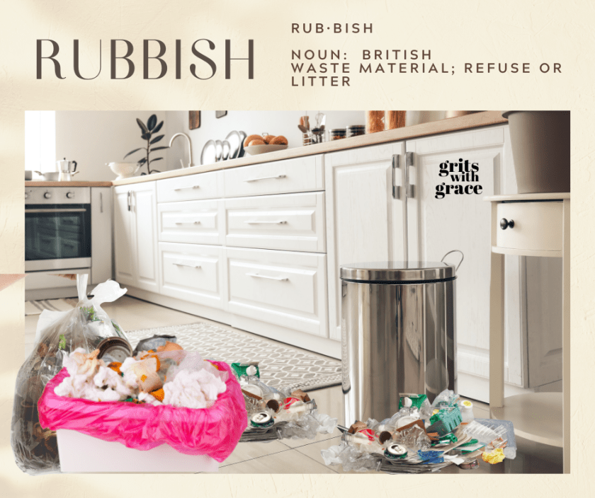 All the trash, whether it is from the kitchen, or the rest of the rooms ends up in the monster size can outside. Once a week, the trash guys drive by the house, grab the can, and dump it into their truck and off it goes wherever trash goes that they collect. All I know is I am grateful that someone takes care of all my rubbish (that’s a British word I learned while in England) so I don’t have to deal with it anymore. How about that?!