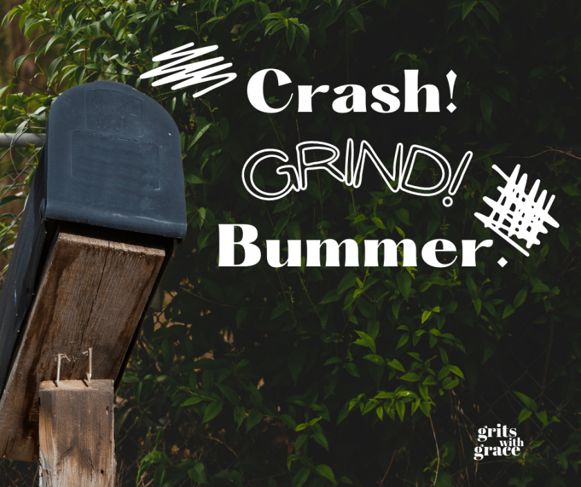 Apparently, I had opened the back door on the driver’s seat to put something in the backseat and didn’t close the door all the way. As I pressed the gas pedal, the rear door swung open and that is when Mr. Inexperience took over. I heard the road noise, look over my shoulder and saw that the door was open. Well, instead of stopping and closing the door I tried to turn and reach over my shoulder to close the door.  When I turned and reached, I accidentally turned the wheel and, gulp, I ran right into—or actually over—one of our neighbors’ mailboxes. Crunch, grind, bummer.