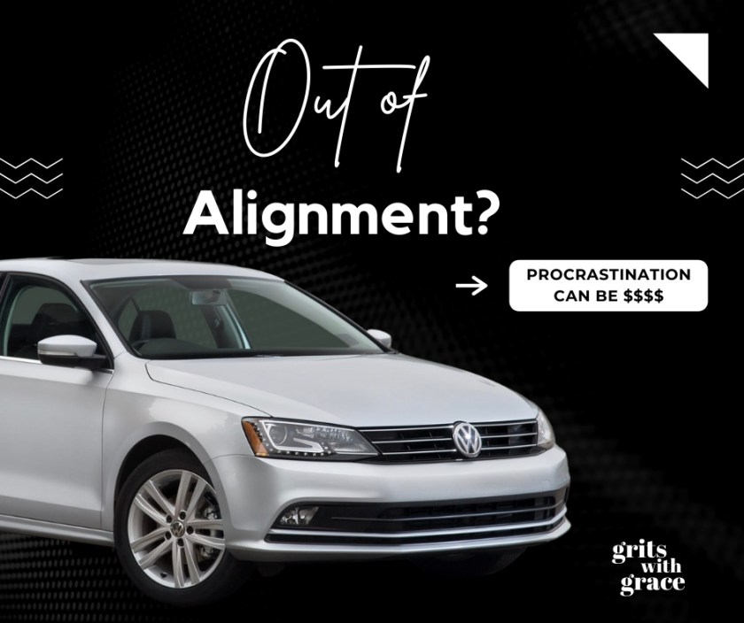A few days later we got the front end aligned and sure enough there it was—the VW emblem was straight up and down.  Yay—I said. Problem solved…and it was.  However, the problem was that I had waited too late.  I noticed a little later that my front tires tread on the outside was virtually gone…outta there. My choice to ignore and live with a problem ended up costing me nearly $500.00 for new tires.  Bummer.  Big bummer. Oftentimes, procrastination can be very expensive.