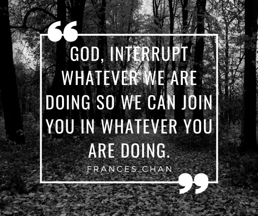 Francis Chan said, “God, interrupt whatever we are doing so that we can  join You in what You’re doing.”  I like that…a lot.  I am certain that life’s hot mess and its overflow was a big interruption in our lives. Absolutely, positively, no doubt about it.