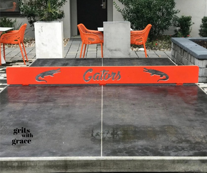 The family asked me to do a chunk of her memorial service and I was pleased to do so.  The service was all about Maryjo, the Gators and Jesus.  We stayed at a hotel in Gainesville, and something almost immediately caught my eye.  Virtually everything, and I do mean everything, was Gatorized.  The primary decorating colors were blue and orange and Gator flags, Gator plaques, Gator pictures, and Gator knick knacks filled the main lobby and sitting area.  They even had a ping pong table, and the net was not a net at all but a solid wall of sorts painted orange with a Gator carved in the middle.