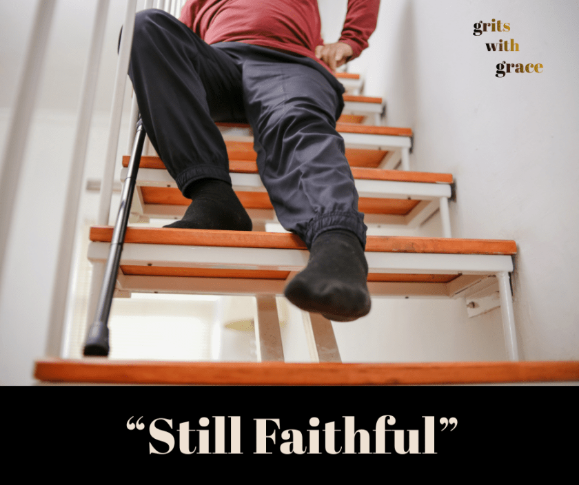 Faster than you can say, “Shoot that thing” I was down. Two things still amaze me. First is how quickly the unexpected can happen.  Second, how gracious God is. Period. So, my wife Judy had a meeting and she asked me to tag along. After a bit of reluctance, I agreed and headed upstairs to get dressed. I put on a fresh shirt and then headed back downstairs.
