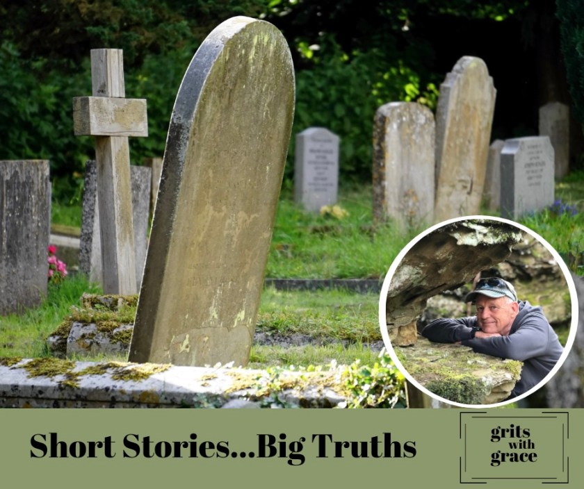 Short stories with big truths.  Hmmm. That came home one morning as I was walking.  Sometimes, maybe once a week, I take my walk through our local cemetery.  It is rather large and if I make a couple of laps around the outside coupled with a shorter one, I end up with about two miles.  As I have written before, I love this walk because of all the life stories you can find on the headstones.  I take the same route each time…I am a creature of habit.  What I saw this morning I had seen many times before but this morning it spoke to me.