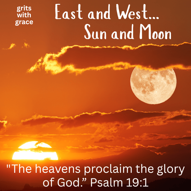 So there it was–East and West–sun and moon both proclaiming the greatness and goodness of God. Psalm 19:1 says it best, “The heavens proclaim the glory of God.