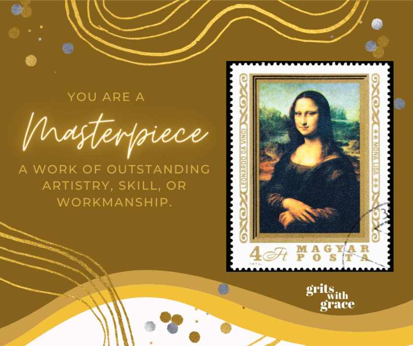 Ephesians 2:10 is one of my absolute favorites.  It seems to pop up over and again in Grits.  It says,  “For we are God’s masterpiece. He has created us anew in Christ Jesus, so we can do the good things He planned for us long ago.” You see an artist far more talented, far more substantial than Leonardo de Vinci created you.  He carefully applied stroke after stroke and then stood back, looked at His work, and declared you a masterpiece.  Declared you, yes you, a masterpiece.