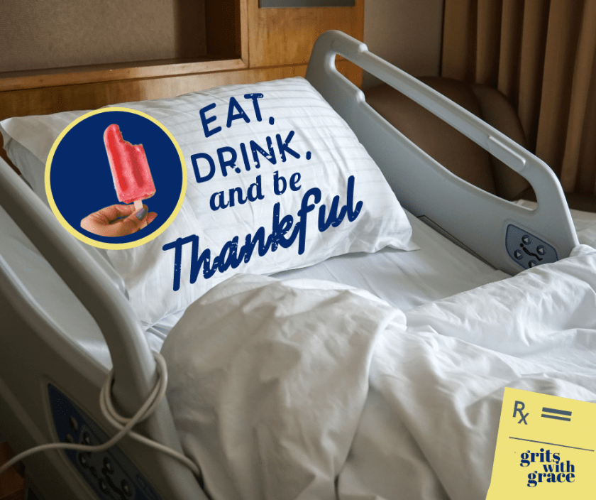 For the first few days I was pretty out of it but finally I turned a corner and began to feel a little better. Because of how diverticulitis works, I couldn’t have anything to eat—and very little to drink–for several days.  Now those of you who regularly read Grits know that food and I are best friends so for me to go several hours…much less days…without eating is something strange indeed.  Finally, one morning, the nurse came in and asked if I would like some WATER.  Oh, was I grateful.  “Yes, yes,” said the thirsty preacher.