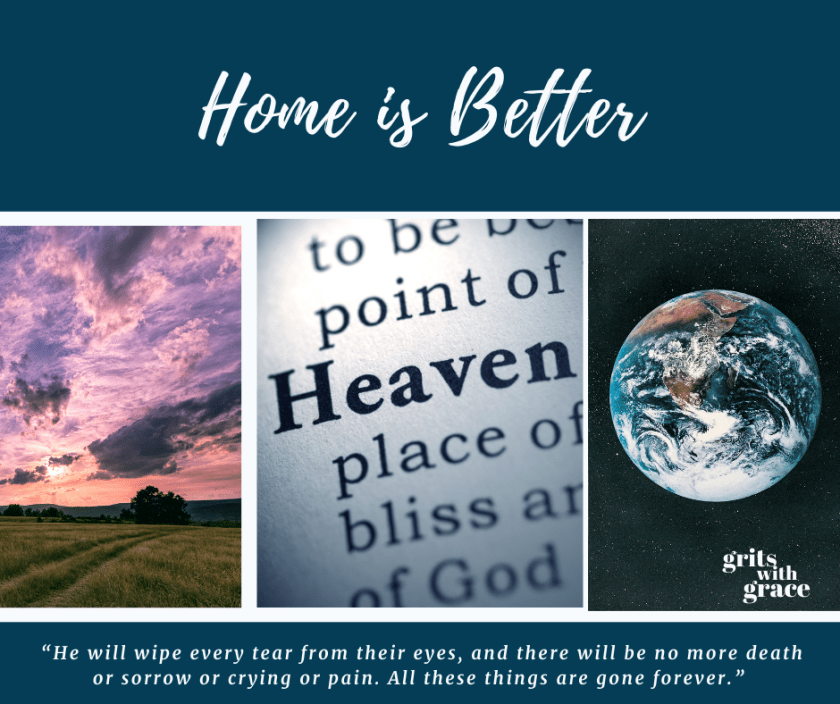 Jesus followers need to remember that very important truth—Home is better—Home is home.  This world is good.  We enjoy life with friends and family, and there is a McDonald’s on every corner.  But what used to remind us of home now reminds us that we are not there…yet. Even with all its warts and imperfections, God has done a great job providing us a temporary location to live out our days, but remember, Home is going to be—better.  The Bible tells me that Heaven is a place where there is no more pain, suffering, sickness or sorrow.  No hospitals, no nursing homes, and no funeral homes.  Simply put—the former things are gone, and everything will be new.  Home will be better.